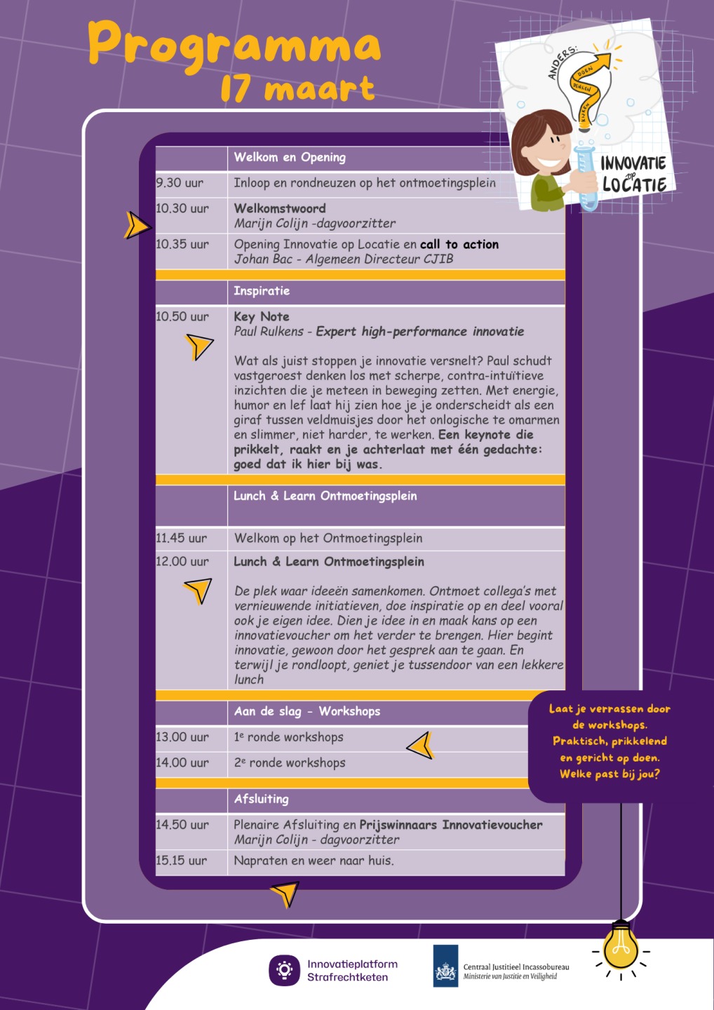 Programma Innovatie op Locatie 17 maart Hier vind je het programma van 17 maart. Afbeelding Workshops Meld je hier aan Startpagina JavaScript moet ingeschakeld zijn om dit formulier te kunnen gebruiken. Vindt u deze informatie duidelijk? Ja Nee Hoe kunnen we deze pagina verbeteren? Versturen Afdrukken Delen